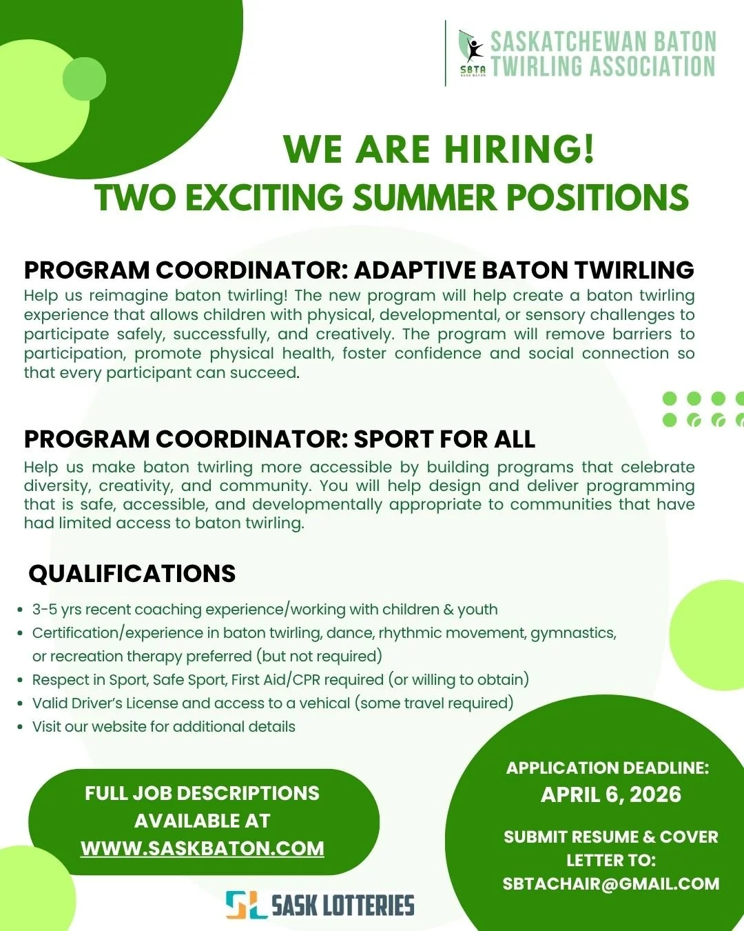 We coordinate, develop, assist, promote, and provide opportunities for the residents of Saskatchewan to participate in the sport of baton twirling as athletes, coaches, officials, organized clubs, and volunteers at introductory, recreational, competitive, and high-performance levels.